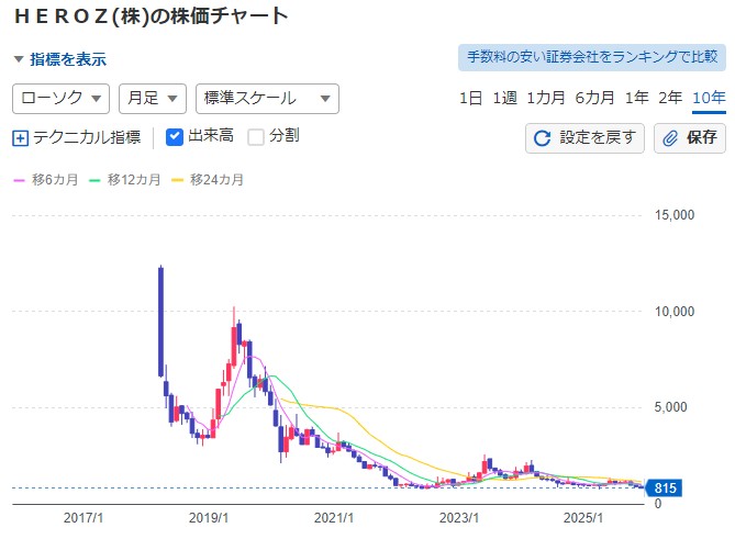 現在の株価を見て、思わず二度見してしまいました。 815円(2025年12月19日終値)。上場直後に12,000円を超え、日本のAI産業の未来を背負うと期待されたあのHEROZ(4382)が、です。 ここまで下がるとは……というのが正直な感想です。