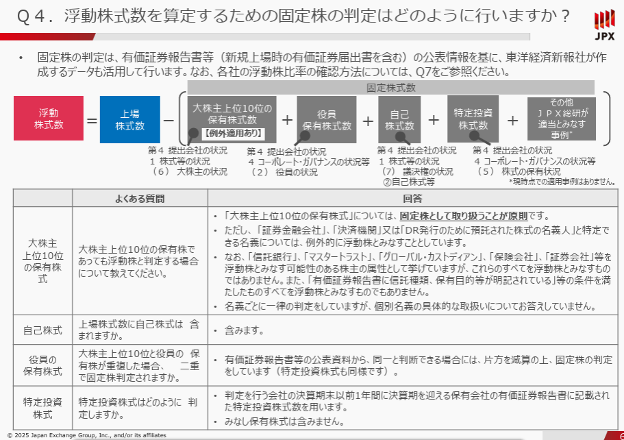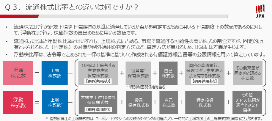 さらに厄介なのが、計算の元となる「浮動株比率」の定義です。 JPXは独自のルールで固定株・浮動株を判定しており、その詳細な内訳は非公開です。「年に一度、JPXから公開される」という運用になるようです。
